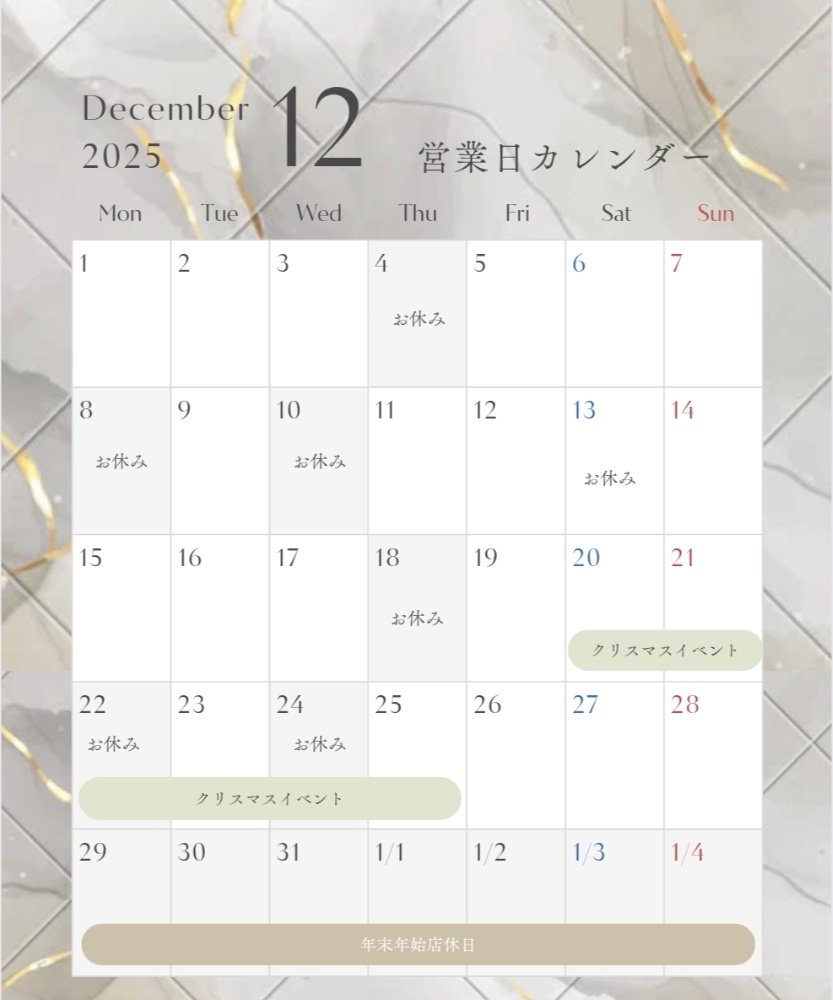 | お知らせ | 水曜日がお休み多めですが、 お休みは月毎に変わりますので カレンダーでご確認ください。 年末年始のお休み 12月29日(月)〜1月4日(日) |