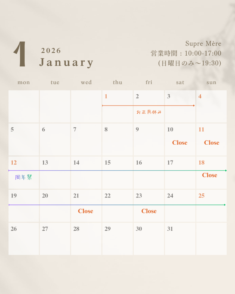 | お知らせ | 水曜日がお休み多めですが、 お休みは月毎に変わりますので カレンダーでご確認ください。 年末年始のお休み 12月29日(月)〜1月4日(日) |